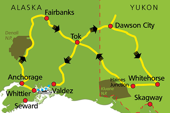 Der erste Teil der heutigen Etappe führt über den Tok-Cutoff Highway, entlang an zahllosen Flüssen, Seen und Gletschern vorbei am imposanten Wrangell - St. Elias Nationalpark. Später geht’s dann weiter über den Richard¬son Highway in südlicher Richtung an die Pazifikküste bis zur kleinen Hafenstadt Valdez. Spektakulär ist dabei die Überqürung des Küstengebirges über den Thompson Pass mit seinen direkt an der Straße gelegenen tosen¬den Wasserfällen. Valdez, von alpiner Umgebung eingerahmt wird von seinen Bewohnern auch Little Switzerland genannt. Bekannt ist der Ort aber auch dadurch, dass hier die weltberühmte Trans-Alaska Pipeline endet und die großen Öltanker beladen werden.