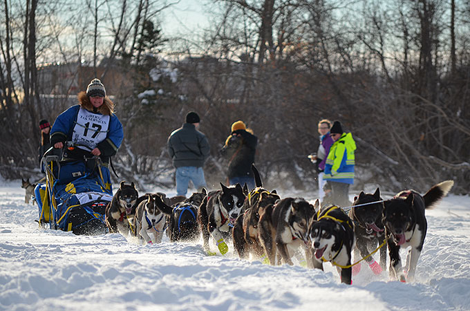 Die ersten Teams treffen ein! Die Feuerwehr Sirenen kündigen das erste Team an, das Dawson erreicht und alle eilen zum Check-Punkt, um zu sehen wer es ist. Der sogenannte "Musher", der Fahrer des Hundeschlittens erhält einige Unzen Gold von der Stadt als Belohnung. Sie werden miterleben können, wie die Musher und deren Handler sich auf den nächsten Teil des Rennens vorbereiten. Natürlich werden Sie auch die 14 Huskies kennenlernen, die jedes Schlittenteam ausmachen. Dadurch, dass die Teams über den ganzen Tag verteilt in Dawson City ankommen, haben Sie immer wieder tolle Fotomotive. Zwischendrin werden Sie noch mehr über die Geschichte des Gold Rush und der örtlichen Trondek Hwechen (Han) First Nation erfahren.
