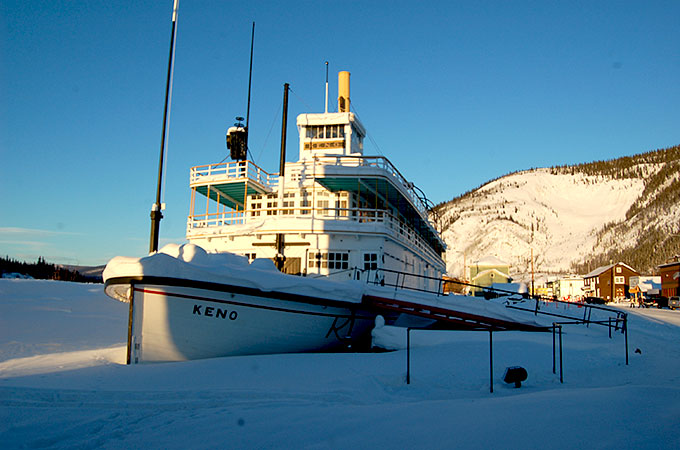 Je weiter Sie in Richtung Norden vordringen, umso mehr sehen Sie die ernorme Größe und Schönheit dieser atemnebraubenden Schönheit. Der Yukon ist halb so groß wie Ontario und fast 1,5 mal so groß wie Deutschland mit nur ca. 35.000 Einwohnern. Entlang des Yukon Rivers fahren Sie durch ein paar vereinzelte Siedlungen wie Braeburn, Carmacks, Pelly Crossing und Stewart Crossing, bevor Sie zu den Ogilvie Mountains gelangen. Sie erreichen den berühmte Klondike River an dem 1898 der letzte große Gold Rush statt fand. Fast 50.000 Goldgräber erreichten im Jahr 1898 den Klondike und machten Dawson City zur größten Stadt westlich von Winnipeg (Kanada) und nördlich von Seattle (USA)! Heute steht Dawson City unter Denkmalschutz und hat immer noch den Charme einer Goldgräberstadt aus der Jahrhundertwende. Die Saloons haben noch halbhohe Schwingtüren und viele Gebäude eine Holzfasade mit hölzernen Gehsteigen und Kiesstraßen davor. Hier können Sie einige der alten Gebäude und Sehenswürdigkeiten bestaunen, wie das Palace Grand Theater, die ehemalige Territoriale Legislatur (heute ist hier das Dawson City Museum), die Commissioners Residence, die SS Keno und die Häuser der weltberühmten Autoren des Klondike, Robert Service, Pierre Berton und Jack Londo. Auch am Check-Punkt des Yukon Quest wird gehalten, um die voraussichtlichen Ankunftszeiten der ersten Teams herauszufinden. Halten Sie Ausschau nach Nordlichtern! Diese sind oft direkt über der Stadt zu sehen.