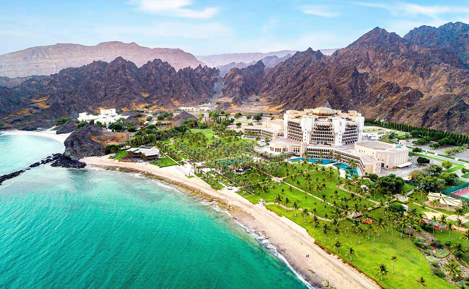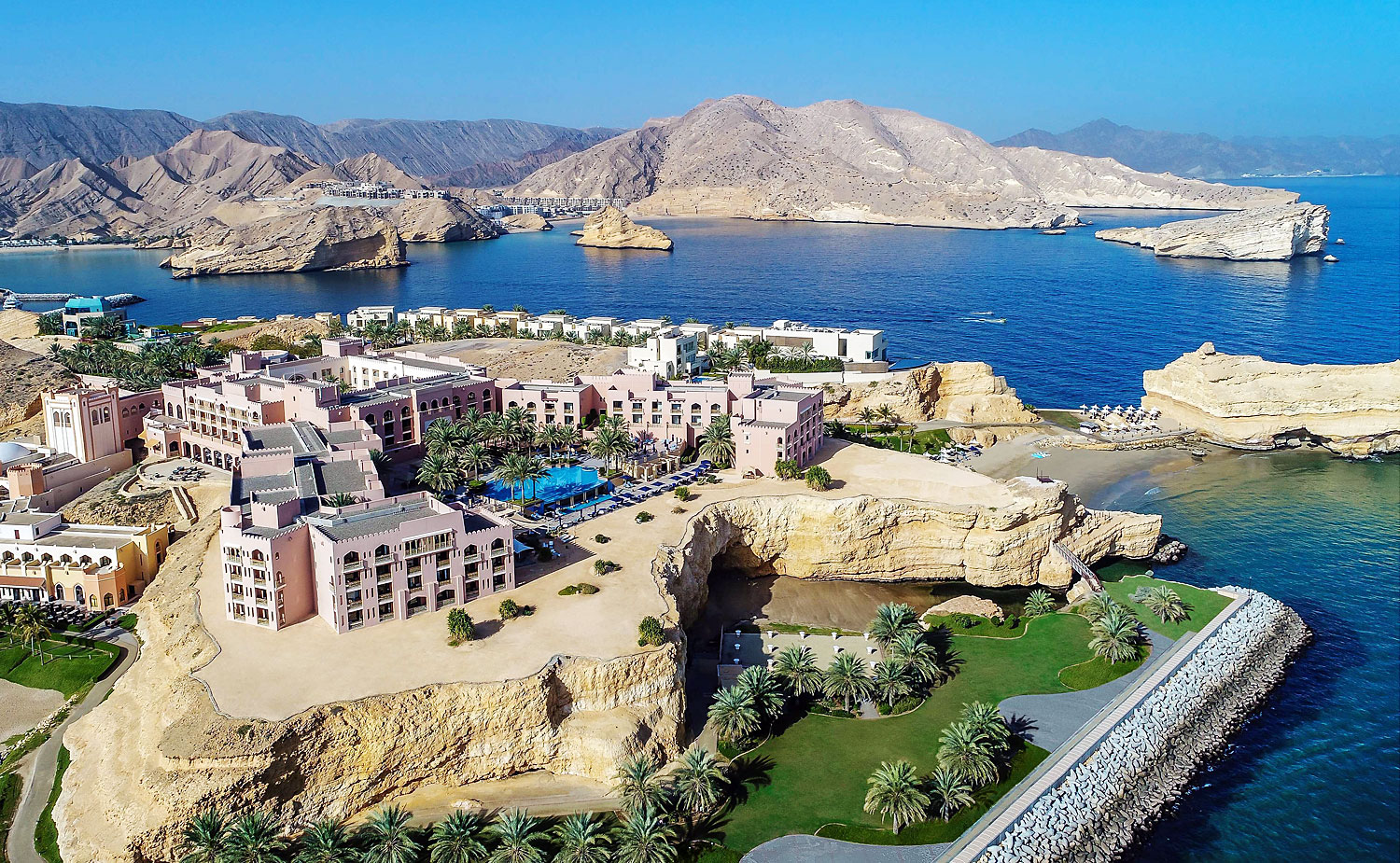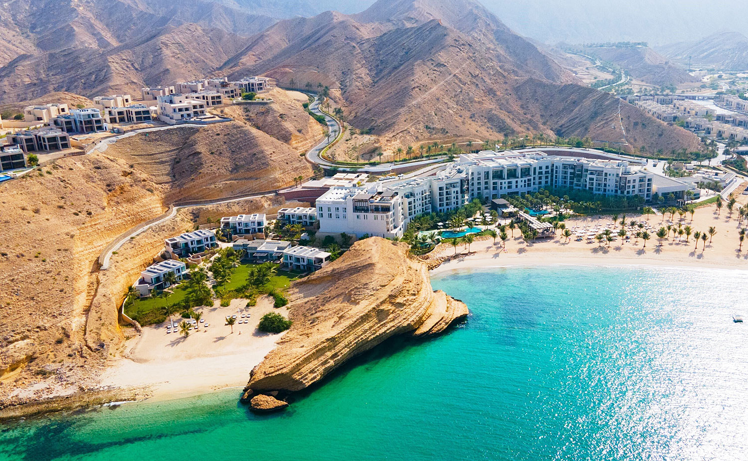 Zwischen den dramatischen Felsen des Hajar-Gebirges und dem glitzernden Blau des Golfs von Oman liegt Bandar Jissah – ein Küstenparadies nur eine halbe Stunde von Muscat entfernt. Hier treffen Luxus und Landschaft aufeinander: smaragdgrüne Buchten, leuchtend weiße Strände und Felswände, die im Abendlicht rosa schimmern. Ob beim Schnorcheln, auf Bootstour oder beim Blick von den Hügeln – Bandar Jissah zeigt, wie nah im Oman Wildnis und Eleganz beieinanderliegen.