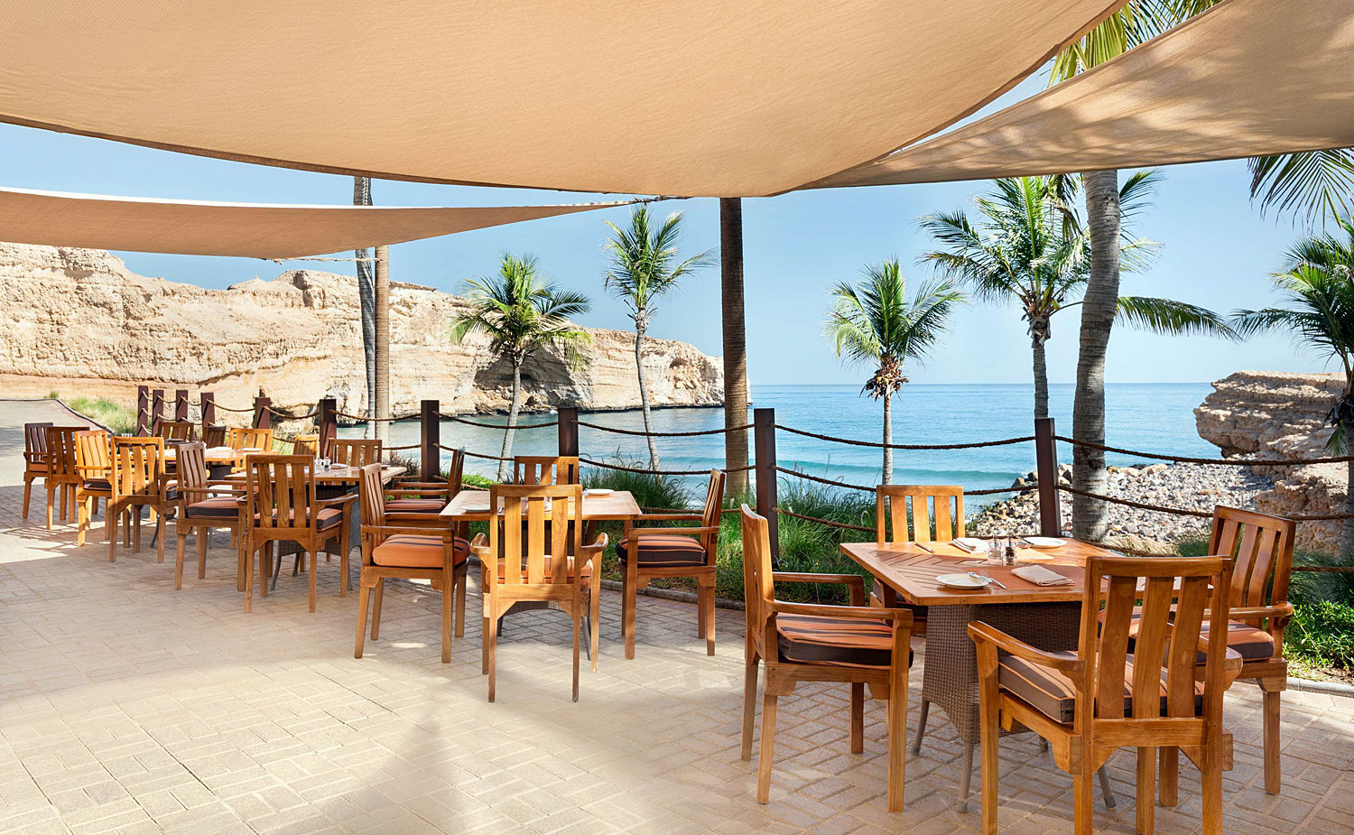 Wenn Sie die Küste erkunden wollen, starten Sie von Bandar Jissah aus zu kleinen Wanderungen in den Hügeln oberhalb des Resorts – Pfade führen über Felsen mit wildem Blick auf das Meer, ideal bei Sonnenauf- oder -untergang. Der Aussichtspunkt Bandar Jissah bietet einen faszinierenden Blick auf die Ophiolit-Gesteine, die als schokoladenfarbene Felsen die Farben von Himmel und Wasser kontrastieren. Am Strand bei Qantab, das in Sichtweite liegt, können Sie lokale Fischerdörfer erleben – wie der Alltag dort aussieht, wenn die Fischer früh aufs Meer hinausfahren und frischen Fang bringen. Auch Tauchen oder Schnorcheln vor den Küstenriffs bieten sich an, besonders bei ruhigem Meer. Für Reisende mit Interesse an Architektur und Design lohnt ein Spaziergang durch das Resort und Umgebung, um traditionelle Formen wiederzufinden – ornamentale Türen, Holzverzierungen, natürliche Materialien – alles wirkt hier so, als wäre es bewusst so gestaltet, dass Natur und Kultur sich spiegeln.
