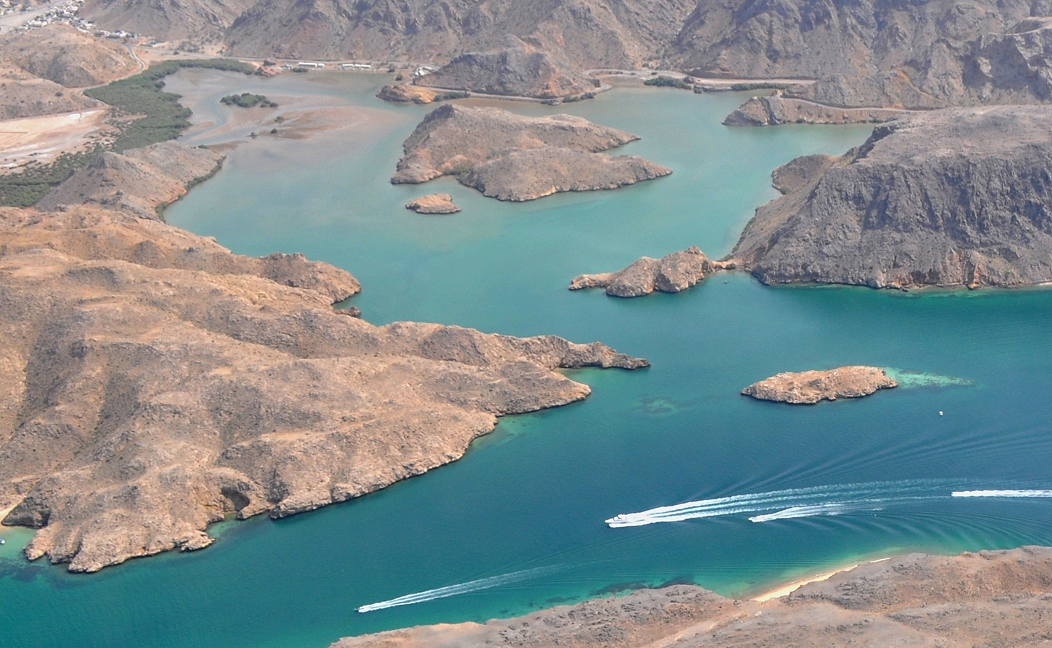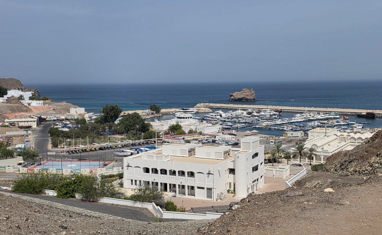 Bandar Jissah (auch Bandar al-Jissah) liegt östlich von Muscat, wo das Hajar-Gebirge abrupt in den Golf von Oman abfällt. Nur rund 20 Minuten von der Altstadt entfernt, entfaltet sich hier eine der eindrucksvollsten Küstenlandschaften des Landes: steile Klippen, zerklüftete Felsen, geschützte Buchten und Wasser in allen Schattierungen von Türkis bis Tiefblau. Der Duft von Salz und Stein liegt in der Luft, während Dhows, die traditionellen Holzboote, gemächlich vorüberziehen. Besonders lohnend ist ein Halt am Bandar Jissah Viewpoint, von dem sich Trockenfelsen, Ophiolitgestein und die dramatischen Küstenwände in ganzer Pracht zeigen – ein Anblick, der selbst die Kamera kurz vergessen lässt. Zwischen Felsen und Meer liegt Muscat Bay (früher Saraya Bandar Jissah), ein Ensemble aus Resorts, Villen und Boutique-Hotels, das sich harmonisch in die Landschaft fügt. Architektur und Natur treten hier in einen stillen Dialog – die Bauten folgen den Konturen der Felsen, und das Meer scheint stets nur einen Atemzug entfernt.