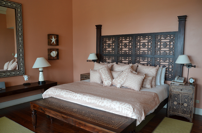 Die Sea Cabanas Beach View und Beach Front liegen nur wenige Meter vom Meer entfernt und verfügen über Möbel im Kolonialstil, einen Flachbildfernseher, zwei Sessel, Deckenventilatoren, einen Safe, eine moderne Badewanne mit Kronleuchter und separater Dusche, runde Fenster, eine Wet Bar, einen Kühlschrank, eine Kaffeemaschine, eine Regendusche im Freien sowie eine überdachte Außenterrasse.