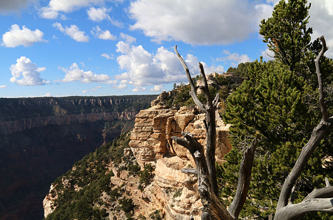 Der North Rim, der nur über den Grand Canyon Highway 67 zu erreichen ist, ist die weitaus ruhigere Region des Grand Canyons. Hier stehen Sie mit etwas Glück schon einmal allein an den Aussichtspunkten und genießen das atemberaubende Panorama. Auf dem Kaibab Plateau am südlichen Ende des Highway 67 befindet sich der Bright Angel Point mit seinem spektakulären Blick über den gewaltigen Canyon. Hier beginnt auch der North Kaibab Trail, ein ca. 25 km langer Wanderweg, der bis hinunter zum Colorado River führt. Weiter östlich befindet sich das Walhalla Plateau mit weiteren Aussichtspunkten, wie z. B. dem Walhalla Overlook mit den Walhalla Ruins, den Überresten eines Dorfes aus dem 11. Jahrhundert. Aufgrund der höheren Lage ist es am North Rim kühler als am South Rim und im Winter gibt es starke Schneefälle, was zu einer kürzeren Tourismus-Saison führt. Der North Rim ist in der Regel von Mitte Mai bis Mitte Oktober geöffnet.