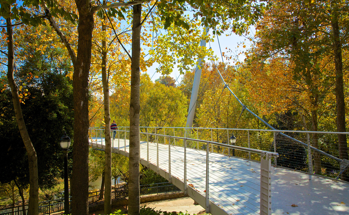 Ein Muss in der Region um Greenville ist der Ausblick vom „Granitblock“ auf der beeindruckenden Blue Ridge Klippe – er ist wirklich einfach atemberaubend! Etliche Wanderwege verschiedener Schwierigkeitsgrade, von leicht bis herausfordernd, führen durch den Caesars Head State Park und den benachbarten Jones Gap State Park. Die State Parks haben zusammen eine Fläche von 110 qkm und sind unter dem Namen Mountain Bridge Wilderness bekannt. Einer die populärsten Wanderwege führt zu den 140 m hohen Raven Cliff Wasserfällen, wo man von einer Hängebrücke aus ganz nah erleben kann, wie das Wasser in die Tiefe stürzt.