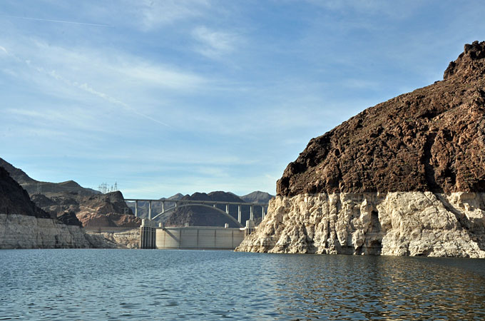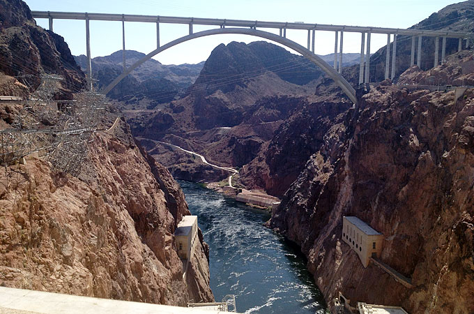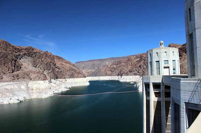 Der weltberühmte Hoover Dam befindet sich nur etwa 50 km südöstlich von Las Vegas im Black Canyon, genau an der Grenze zwischen Nevada und Arizona. Das Absperrbauwerk des 232 Meter hohen Staudamms staut den Colorado River zum Lake Mead auf, der eine Fläche von knapp 70.000 Hektar aufweist. Damit ist er der größte Stausee der USA. Nebenbei versorgt der Lake Mead die Las Vegas Region, große Teile Nevadas, Arizonas und Kaliforniens mit Trinkwasser und wird zudem zur Stromgewinnung genutzt. Der Hoover Dam gilt als eine der beliebtesten Sehenswürdigkeiten in der näheren Umgebung von Las Vegas. Wundern Sie sich nicht über die starke Polizeipräsenz am Hoover Dam. Der Damm ist als Hochsicherheitszone eingestuft und wird deshalb stets akribisch von der Hoover Dam Police bewacht.