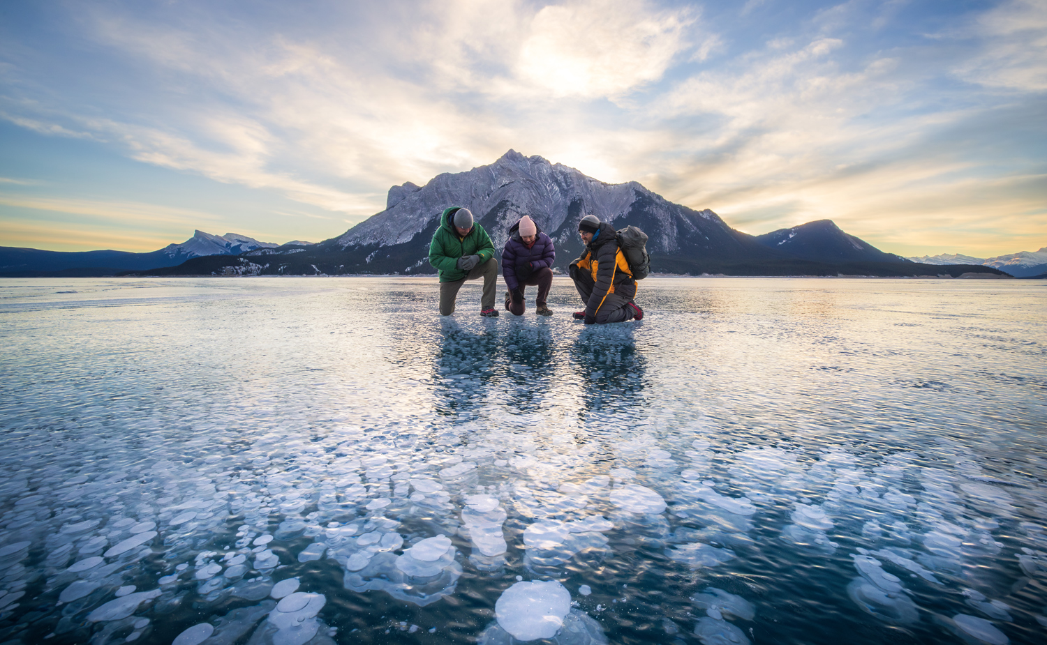 Der Abraham Lake ist bekannt für eingefrorene Methanblasen, die in verschiedenen Tiefen gefangen sind und wie kleine Planeten im Eis wirken – ein wahrhaft surreales Naturschauspiel.