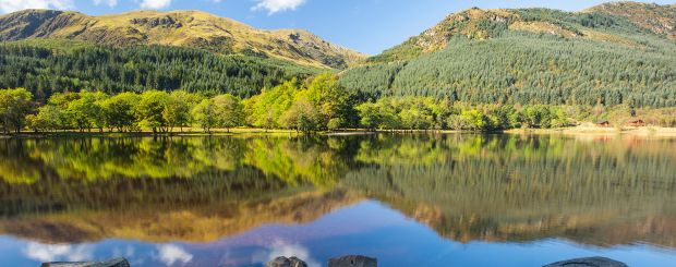 In Schottlands erstem Nationalpark, dem Loch Lomond & The Trossachs Nationalpark, gibt es weite, üppige Landschaften zu entdecken. Die Verwerfungslinie, die die Highlands von den Lowlands trennt, verläuft quer durch den Loch Lomond & The Trossachs Nationalpark und macht diesen Teil der Welt unendlich abwechslungsreich - schroffe Hügel, Wälder und Wasser. Der Loch Lomond lädt zu Bootsfahrten ein und vom Loch aus kann man die gewaltigen Ausmaße des Ben Lomond, mit 974 m der höchste Berg der Region, bewundern.