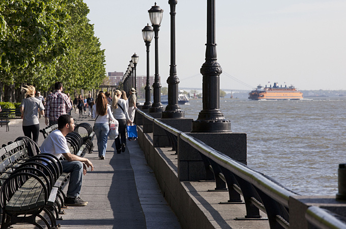 Besuchen Sie den Battery Park, der die Südspitze New Yorks bildet und lassen Sie hier Ihre Seele baumeln, während Sie auf der einen Seite das geschäftige Treiben zwischen den Hochhäusern und auf der anderen Seite die Fähren auf dem Wasser beobachten können. Um New York vom Wasser aus zu betrachten und so einzigartige Fotomotive zu haben, fahren Sie mit der Staten Island Ferry. Die ca. 25-minütige Überfahrt ist kostenfrei. Am Abend müssen Sie sich noch einen Drink in der Rooftop Bar 230 Fifth gönnen. In der wohl besten Rooftop Bar New Yorks haben Sie einen grandiosen Blick auf die Skyline der Stadt.