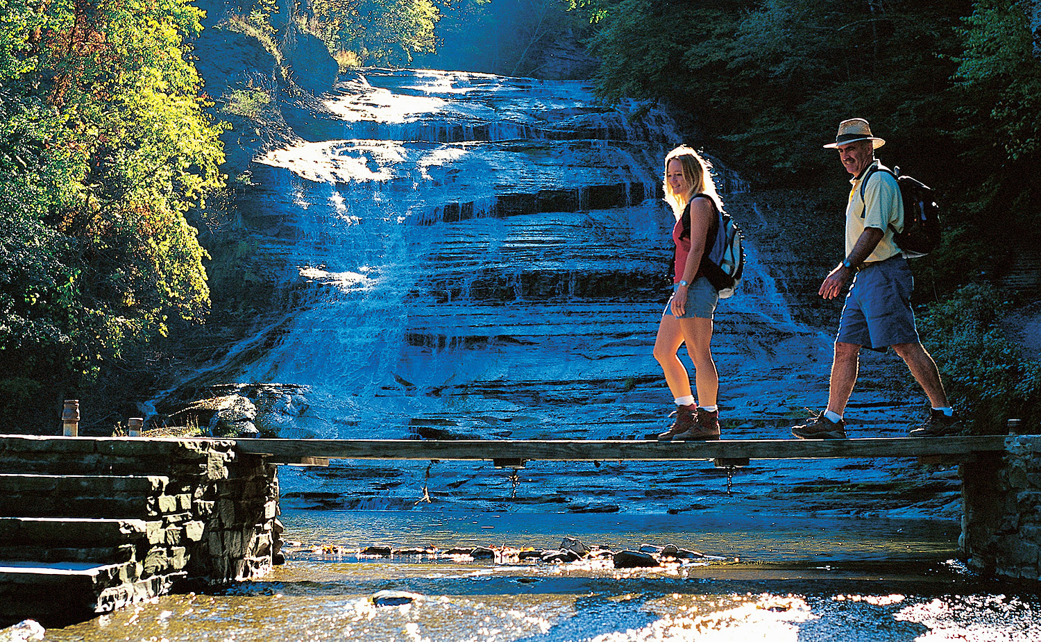 Der Niagara Falls State Park ist der älteste Park in den Vereinigten Staaten. Er wurde 1885 gegründet und vom ersten Landschaftsarchitekten Amerikas, Frederick Law Olmsted, entworfen, der auch für den Central Park in New York City bekannt ist. Die Niagarafälle, die aus drei Wasserfällen bestehen - den American Falls, den Bridal Veil Falls und den Horseshoe Falls -, stürzen jede Sekunde mehr als 2,8 Millionen Liter Wasser in die Tiefe.