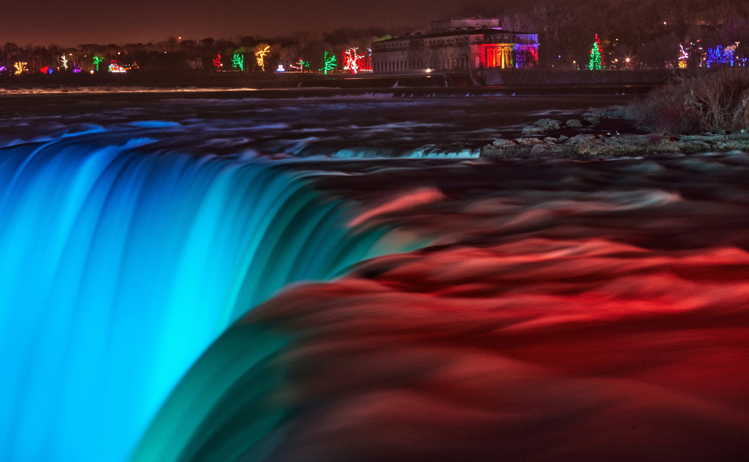 Die Niagarafälle bestehen aus drei Hauptfällen: den Horseshoe Falls, den American Falls und den Bridal Veil Falls. Die Horseshoe Falls, die größten der drei, sind etwa 670 Meter breit und stürzen bis zu 57 Meter in die Tiefe. Pro Minute stürzen etwa 168.000 Kubikmeter Wasser über die Kante. Die Stadt Niagara Falls in Kanada hat rund 94.000 Einwohner (2021) und bietet zahlreiche Unterkünfte, Restaurants und Attraktionen.