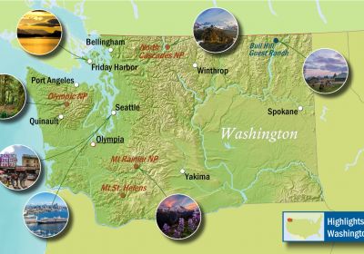 Der „Immergrüne Staat“, so wird Washington wegen seiner üppigen Wälder genannt. Der dichte, subtropische Regenwald im Olympic National Park bildet nur einen Teil dieser Waldfläche. Aber auch kilometerlange Strände entlang des Pazifischen Ozeans, schneebedeckte Berge, trockene Wüsten, felsige Flusstäler und sogar Vulkane (wie den Mount Rainier) auf die man klettern kann, locken Besucher in diese Region. Seattle, eine der schönsten Städte der Welt, und die Pazifikküste mit den vorgelagerten Inseln der San-Juan-Inselkette, an der von Mai bis Oktober Schwertwale zu sehen sind, gelten als weitere Höhepunkte.