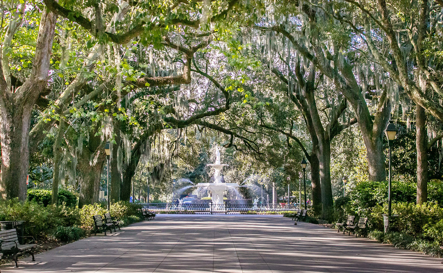 Savannah Historic District, das bedeutet 22 begrünte, quadratische Plätze auf 5,3 Quadratkilometern, verbunden durch weite, baumbestandene Straßen, in denen sich prächtige Häuser aus dem 18. und 19. Jahrhundert aneinanderreihen; das bedeutet Cafés, Bars, Restaurants, Museen und kleine Läden in Hülle und Fülle. Im Historic Distict gibt es die gotisch anmutende Cathedral of St. John the Baptist, die quirlige River Street und ganz viel spanisches Moos, das meterlang von den Ästen alter, knorriger Virginia-Eichen herabhängt. Das 1733 von James Oglethorpe gegründete Savannah ist die älteste Stadt Georgias, gilt als die erste auf dem Reisbrett entworfene Stadt der USA und ist eine der schönsten Städte der Südstaaten. Sie ist elegant und kultiviert, romantisch und geheimnisvoll und sie faszinierend durch ihre Mischung aus Geschichtsverbundenheit und Modernität. Eine Berühmtheit besonderer Art hat der Chippewa Square erlangt. Hier wurde die legendäre Parkbankszene aus Forrest Gump gedreht. Die Bank an der Bushaltestelle, auf der Tom Hanks damals saß und seine Geschichte erzählte, steht inzwischen im Savannah’s History Museum.