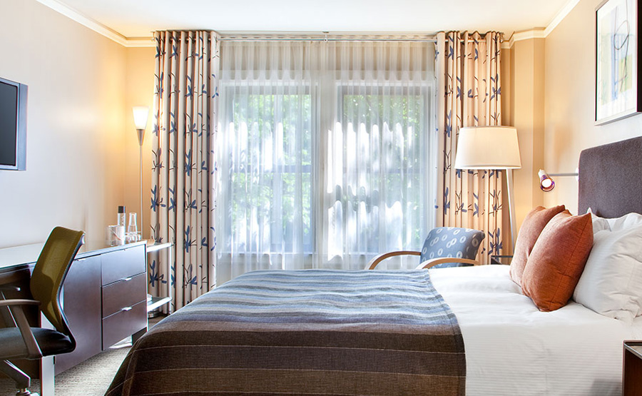 Die Zimmer wurden in warmen Farben gestaltet und verfügen über einen Wasserkocher mit Kaffee-/Teezubehör, einen Fernseher sowie kostenfreien WLAN-Zugang.