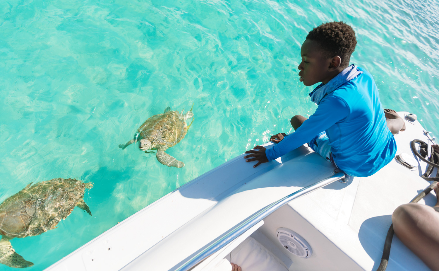 Doch es wäre schade, die Umgebung nicht weiter zu erkunden: Thunderball Grotto – benannt nach dem James-Bond-Film – ist eine fantastische Schnorchel-Location, in der Sonnenstrahlen durch Felsöffnungen auf ein Unterwasserparadies fallen. In der Nähe der Insel Bitter Guana Cay sonnen sich endemische Leguane, die mit ihrem urzeitlichen Charme wirken, als kämen sie direkt aus einem Fantasyfilm. Wer sportlich unterwegs ist, kann Kajaktouren entlang der Inselkette unternehmen oder bei Ebbe zu abgelegenen Sandbänken wandern.